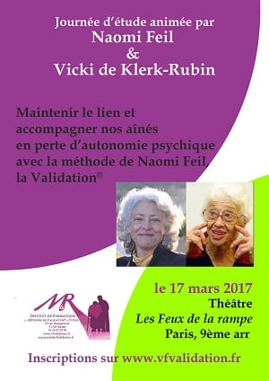 Naomi Feil et Vicki de Klerk animeront une journée de formation à Paris le 17 mars 2017, l’occasion pour Naomi Feil de parler de la méthode de Validation qu’elle a développée il y plus de 50 ans.