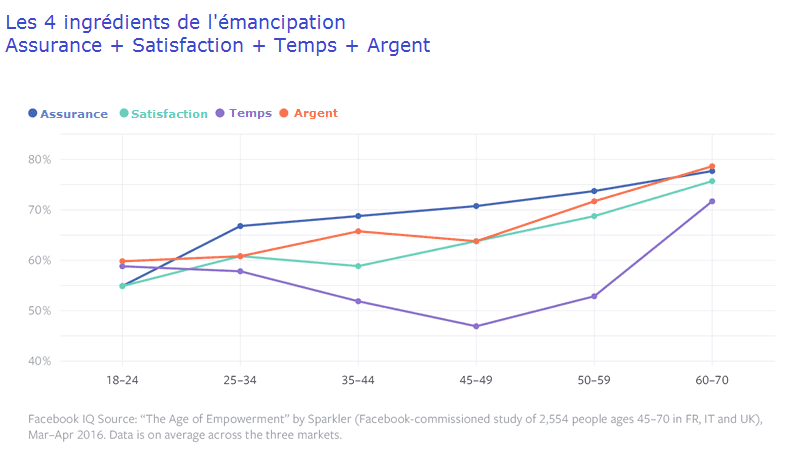 Sparkler, expert en stratégie commerciale des entreprises, a récemment mené une étude sur l’émancipation des personnes et les nouvelles technologies pour le compte de Facebook IQ. Il en ressort que le groupe démographique des 45-70 ans est le plus épanoui, à bien des égards.