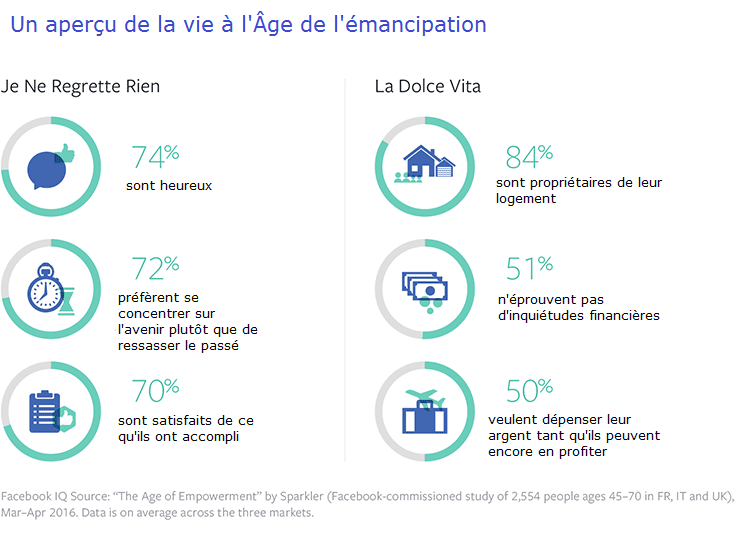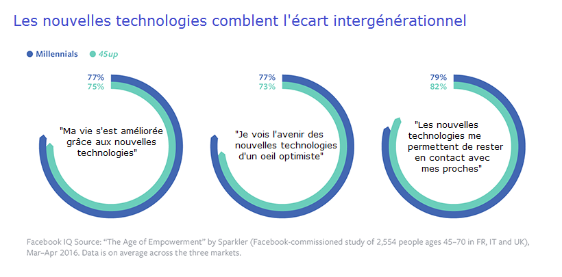 Facebook IQ a récemment fait appel à Sparkler, société spécialisé dans les stratégies commerciales, afin de jauger l’influence des nouvelles technologies sur le bien-être des populations ; celle-ci a interrogé 2 554 personnes âgées de 45 à 70 ans en France, en Italie et au Royaume-Uni afin de cerner leur perception du vieillissement et leurs rapports aux nouvelles technologies. A titre de comparaison, 452 membres de la génération Y âgés de 18 à 34 ans, ainsi que 464 membres de la génération X ont également participé au sondage.