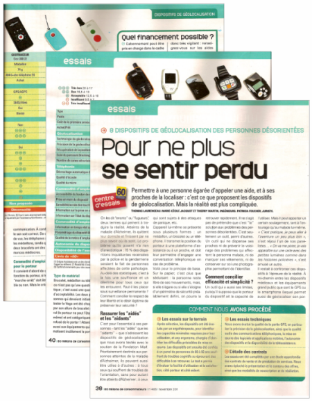 La revue 60 millions de consommateurs dans son N°465 de Novembre 2011 a publié les résultats d’un test de 8 dispositifs de géolocalisation destinés aux personnes désorientées et notamment aux malades Alzheimer. Ce test a été réalisé par l’Institut National de la Consommation, en partenariat avec le soutien de la Fondation MAIF.