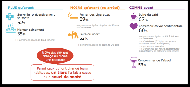 Les résultats de ce sondage, qui se veut un observatoire des modes de vie des Français âgés de 55 ans et plus, montrent que les seniors adaptent facilement certaines de leurs habitudes en vieillissant, notamment pour faire face à des soucis de santé.