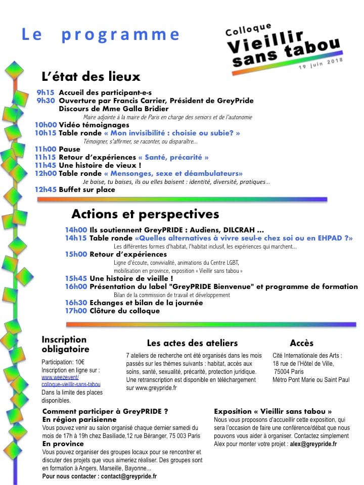Pour préparer le colloque du 19 juin prochain, le collectif GreyPRIDE a organisé 7 ateliers au cours des mois passés sur thèmes suivants : habitat, accès aux soins, santé, sexualité, précarité, protection juridique.