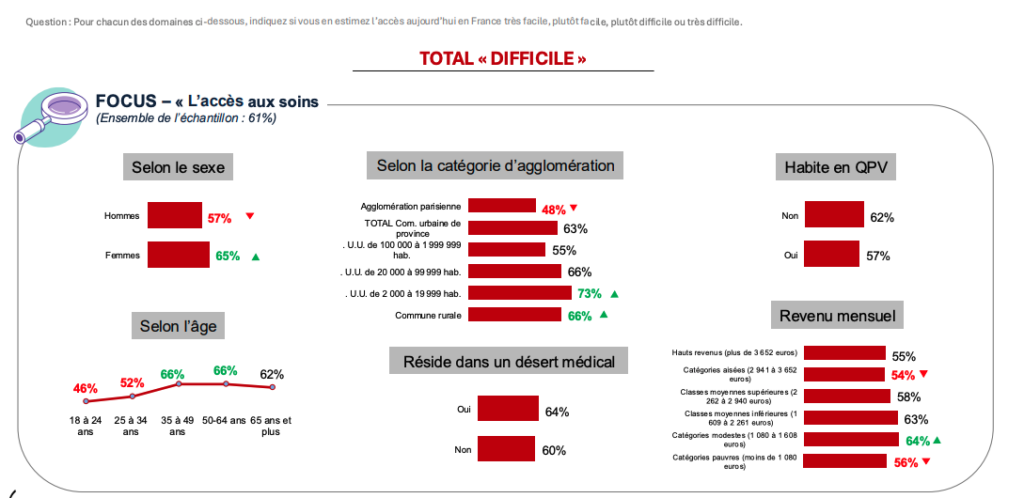 - 66 % des 50-64 ans et 62 % des 65 ans+ jugent l’accès aux soins difficile ; 83 % estiment qu’il s’est dégradé