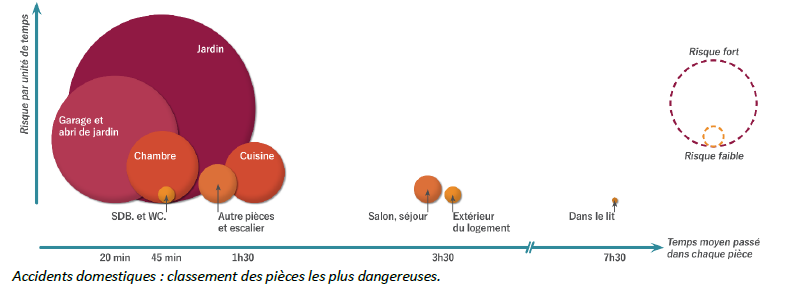 Au sein du logement, la chambre est une des pièces les plus dangereuses, particulièrement pour les enfants, en dépit du fait que les volontaires n’y passaient en moyenne d’une heure par jour, en-dehors des heures de sommeil. Les caractéristiques de la cuisine en font par ailleurs un des repaires favoris des accidents domestiques, beaucoup plus dangereuse que le salon, qui voit passer deux fois moins d’accidents pour la même durée d’occupation. Le lit est également le lieu le moins dangereux du domicile, alors qu’il est fréquenté 7h30 par jour en moyenne.