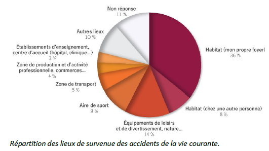 Le domicile est de loin le lieu le plus dangereux au quotidien ; près de 45% des accidents de la vie courante y surviennent, quel que soit l’âge des résidents. Il est suivi des lieux de loisirs et de divertissement et de la pleine nature (14%), ainsi que des aires de sport (9%). Globalement, les activités sportives sont à l’origine de la majorité des accidents de la vie courante.