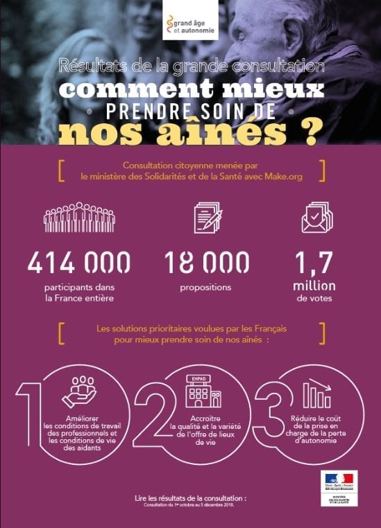 Vendredi dernier, la ministre Agnès Buzyn a révélé les tout premiers résultats de la vaste consultation citoyenne menée par le ministère des Solidarités et de la Santé en partenariat avec Make.org. Pendant 2 mois, les Français ont été invité à répondre librement à la question : « Comment mieux prendre soin de nos aînés? ».