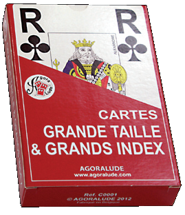 Cartes grande taille et grands index. Ce jeu de 54 cartes aux dimensions adaptées (8 x 12 cm) et aux index augmentés (2 cm de haut) permet à chacun de continuer à jouer malgré des problèmes de vue ou de manipulation.