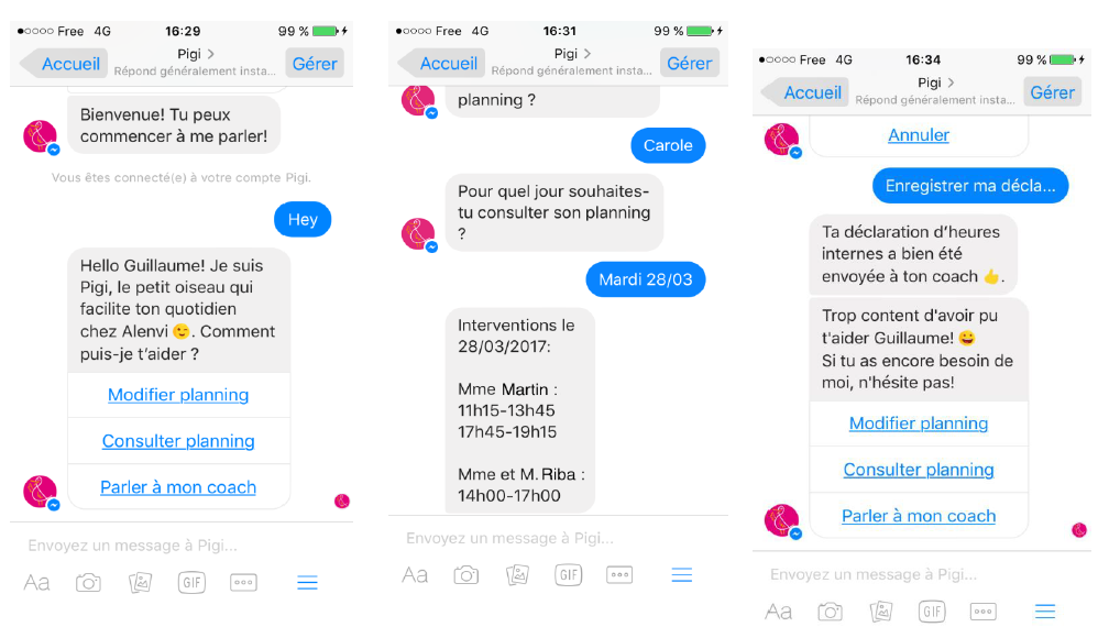 En partenariat avec Ogust, Alenvi a par ailleurs développé un « chatbot » sur la plateforme de messagerie instantanée Messenger, lequel permet aux auxiliaires d’obtenir, via leur mobile, des réponses à toutes leurs questions opérationnelles.