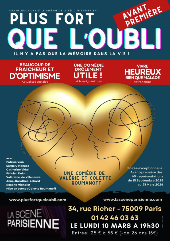 - Une comédie humaine sur Alzheimer : Plus fort que l’oubli, écrite par Colette et Valérie Roumanoff, propose une vision bienveillante et décalée de la maladie d’Alzheimer à travers une pièce drôle et touchante.