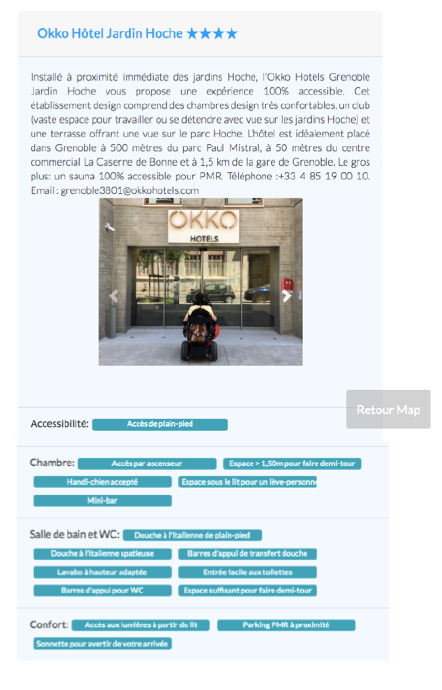 Ensuite, la personne pourra chercher un lieu accessible (dans la barre de recherche) et le localiser facilement sur la carte. Elle pourra aussi connaître des informations détaillées sur l’accessibilité de ce lieu. Ces informations détaillées sont personnalisées en fonction des 3 critères renseignés auparavant.