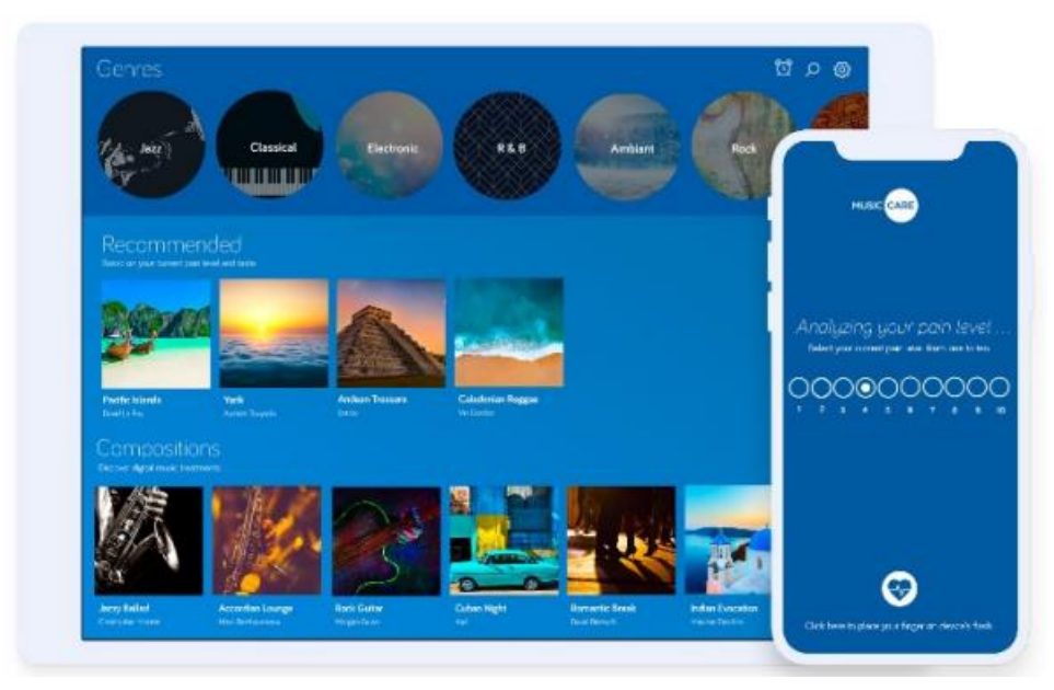Validée par 150 publications scientifiques Music Care développe des solutions thérapeutiques associant musique et neurosciences. Des études démontrent, en effet, que le recours à Music Care diminue de plus de 50 % les consommations médicamenteuses et soulage la douleur de 52 %.