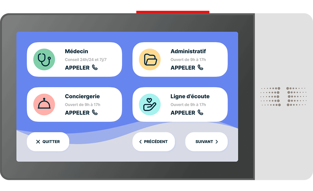 La centrale tactile permet d’intégrer et de centraliser les services proposés au sein de la résidence et ainsi d’en faciliter l’accès : conciergerie, téléassistance, service technique, téléconsultation médicale, accueil…