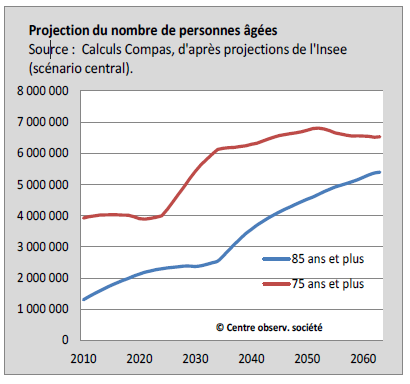 Mais pas seulement. Elles pèsent aussi sur le nombre de personnes qui va être nécessaire pour s’occuper de personnes âgées ayant besoin de services à domicile. Si l’on conserve le ratio du nombre d’aidants par personne âgée de plus de 85 ans stable, quand nous aurons 3,5 millions de personnes de plus de 85 ans en 2040 au lieu de 1,5 millions actuellement, il nous en faudra 2,3 fois plus. Le nombre de personnes dépendantes suivrait une évolution similaire, et leurs aidants familiaux seront de plus en plus âgés.