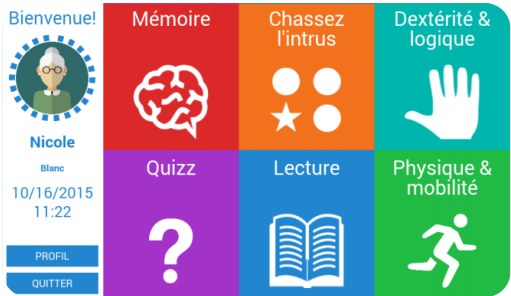 La tablette propose PAT’Gameen plus des fonctionnalités classiques. Il s’agit d’un programme applicatif composé d’activités sous forme de jeux pour répondre aux besoins « Cognitif », « Physique », « Nutritif » et d’ »Estime de Soi ».