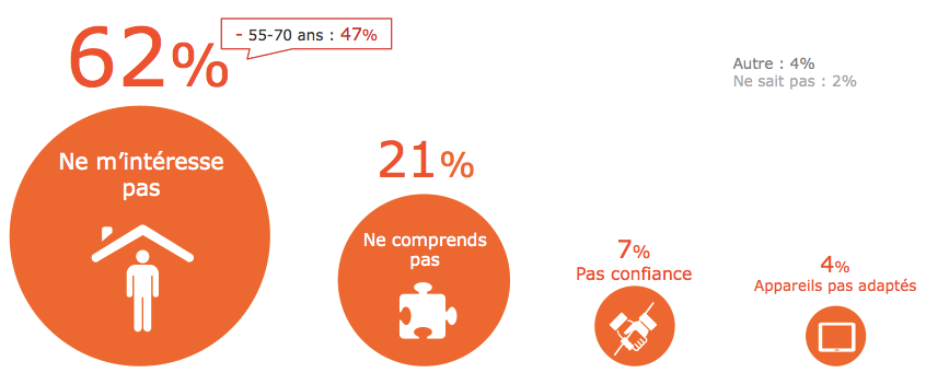 Parmi les non-utilisateurs, les freins sont dominés par une faible appétence d’ensemble (62% d’entre eux) et une forme d’incompétence ou de difficulté à apprendre, qui leur bloque l’accès au digital, et cela pour près d’1 senior non connecté sur 5.