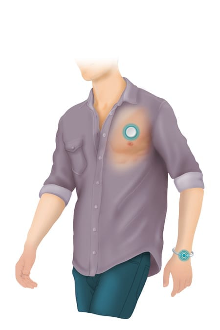 e-Tact est un patch discret qui se fixe sur le torse et permet le suivi de l’activité quotidienne.