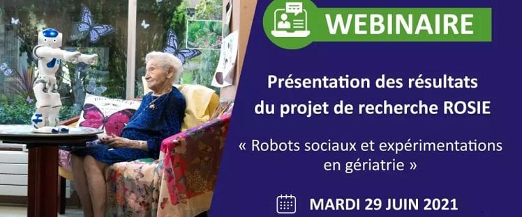 …Mardi 29 juin 2021 de 14h30 à 17h30 sur Zoom, le Gérond’if organise à un webinaire pour présenter le projet de recherche ROSIE qui porte sur l’expérimentation des robots en gériatrie. Gérond’if, le gérontopôle d’Île-de-France en partenariat avec le Living Lab LUSAGE et la Chaire Hospinnomics, vous invite à participer au webinaire de restitution des résultats du projet de recherche ROSIE, visant à établir un état des lieux des expérimentations et des pratiques mobilisant les robots sociaux en gériatrie.
