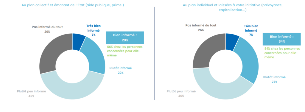 Un facteur-clé de cette inertie ? Le manque d’information : 7 Français sur 10 se sentent mal ou pas du tout informés sur les solutions de financement existantes, qu’elles relèvent de l’initiative individuelle ou de celle de l’État. Une situation qui freine la mise en œuvre de stratégie d’anticipation et entretient un sentiment d’impuissance voire de fatalisme.