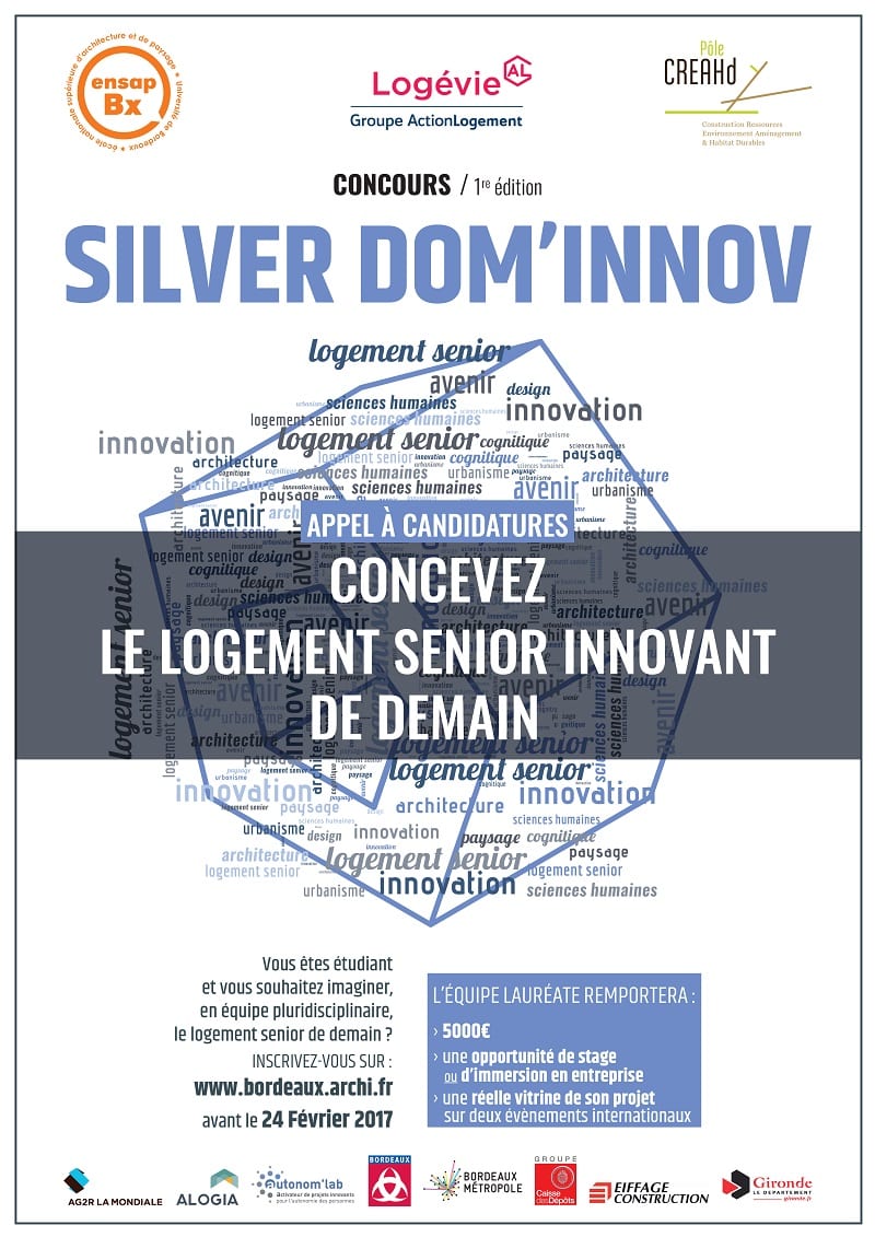 Lancé dans le cadre de la 3ème édition du Colloque européen Silver Economie et Habitat en octobre dernier, le concours « Silver Dom’Innov » s’inscrit dans la plurisdisciplinarité : des étudiants en architecture à partir de la 3ème année, et/ou en dernière année d’ingénierie du bâtiment avec une ouverture à d’autres disciplines en Nouvelle-Aquitaine.