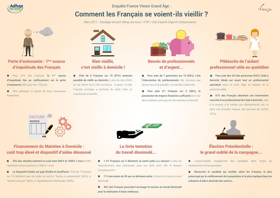 Durant le mois de mars 2017, Adhap Services, en partenariat avec l’IFOP, a souhaité interroger les Français sur leurs attentes, leurs besoins et leurs souhaits en matière de vieillissement.
