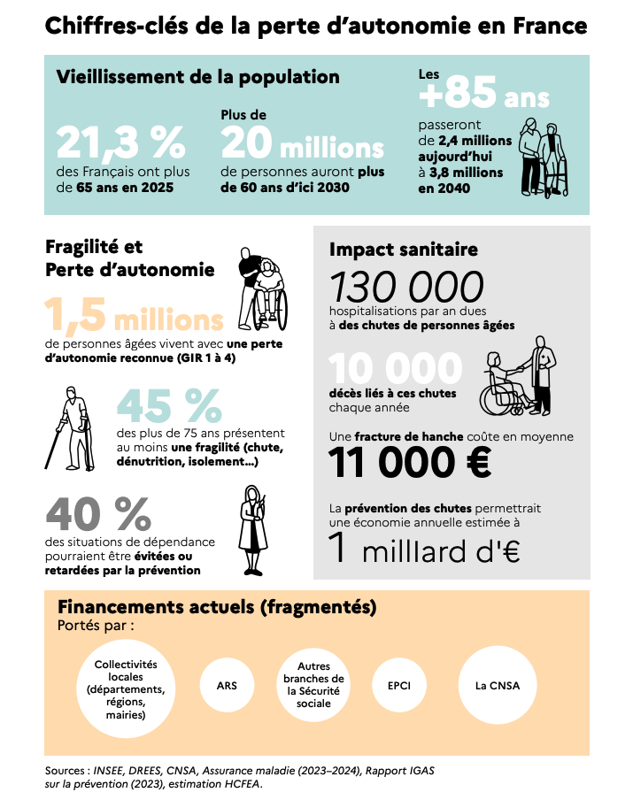 - Mieux prévenir la perte d’autonomie : 40% des situations de dépendance pourraient être évitées par des actions simples, encore trop inégalement déployées, notamment dans les zones rurales et quartiers prioritaires.