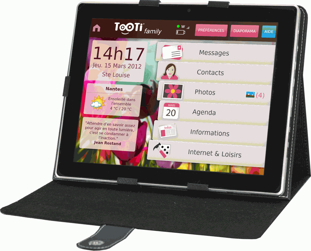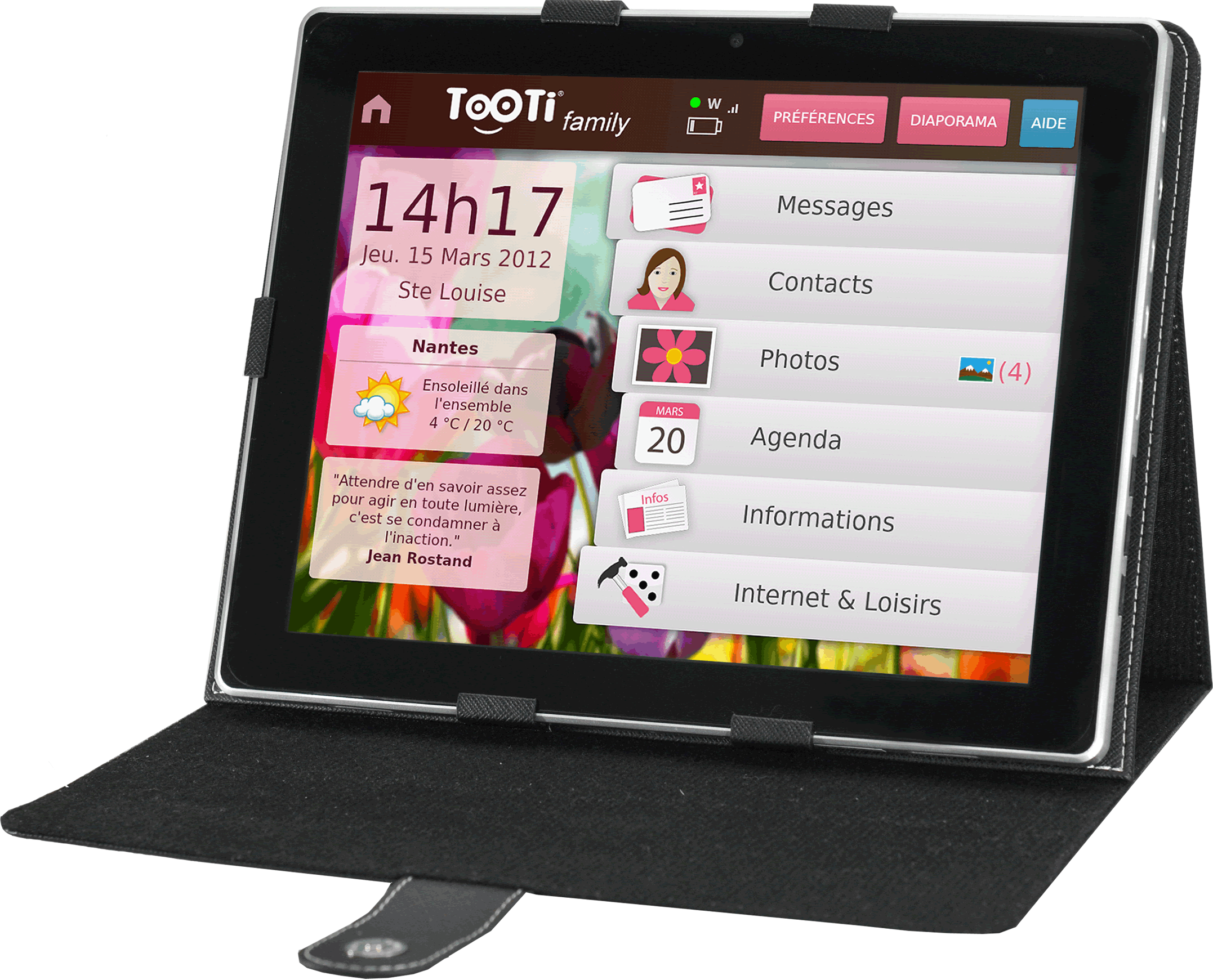 Spécialement conçue à l’attention des seniors, TOOTI Family est une tablette à l’interface simplifiée dont le but est de resserrer le lien social et familial. Facile à utiliser, la tablette créée par la société Tikeasy, une start-up nantaise, s’est imposée comme l’outil technologique le mieux adapté au projet du Centre Social.