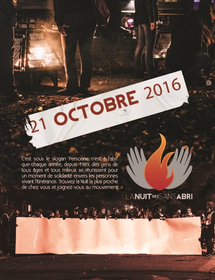 Chaque année au Québec, la Nuit des sans-abri se tient le 3ème vendredi du mois d’octobre. Ce sera donc le 21 octobre pour l’année 2016.