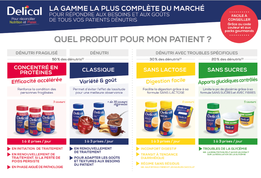 La gamme Delical comporte des boissons lactées, des boissons fruitées, des soupes, des biscuits, des compotes, des crèmes dessert, des plats mixés… répondant aux prescriptions médicales et aux besoins spécifiques des patients.