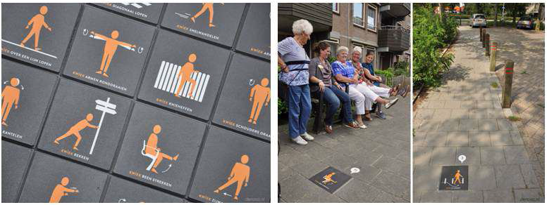 En août 2014, la ville d’Eindhoven (Pays Bas) a créé, en partenariat avec Denovo, un parcours santé ludique adapté aux seniors, mettant à profit son mobilier urbain. Les exercices santé proposés sont indiqués par des dalles intégrées aux trottoirs.
