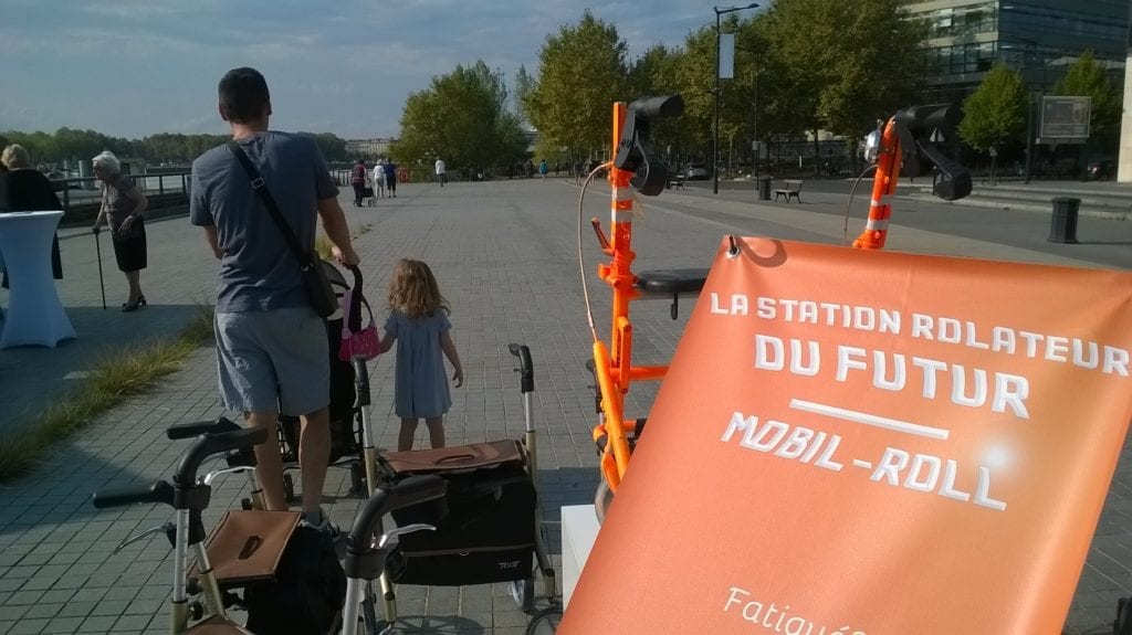 A l’initiative de l’Association Prendre Soin du Lien, le temps d’un après-midi, une station éphémère inédite d’emprunt de rolateurs (déambulateurs à roulettes), la « Mobil’Roll », a été installée quai de Queyries à Bordeaux. Les personnes venues essayer un rolateur, confrontées à l’avancée en âge, ont pu se rendre compte des avantages de cette aide à la marche. Le rolateur sécurise les déplacements de la vie quotidienne et permet de continuer à marcher le plus longtemps possible avec la possibilité de se reposer à tout moment et partout.