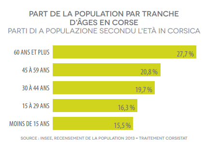 L’Insee prévoit une augmentation de 20 % de la population Corse à l’horizon 2050 et anticipe un vieillissement marqué de la société insulaire. En effet, la part des 60 ans et plus s’élèverait à 41 % de la population, dont le nombre totaliserait à 155 000 personnes, soit une hausse de 13 points entre 2013 et 2050.