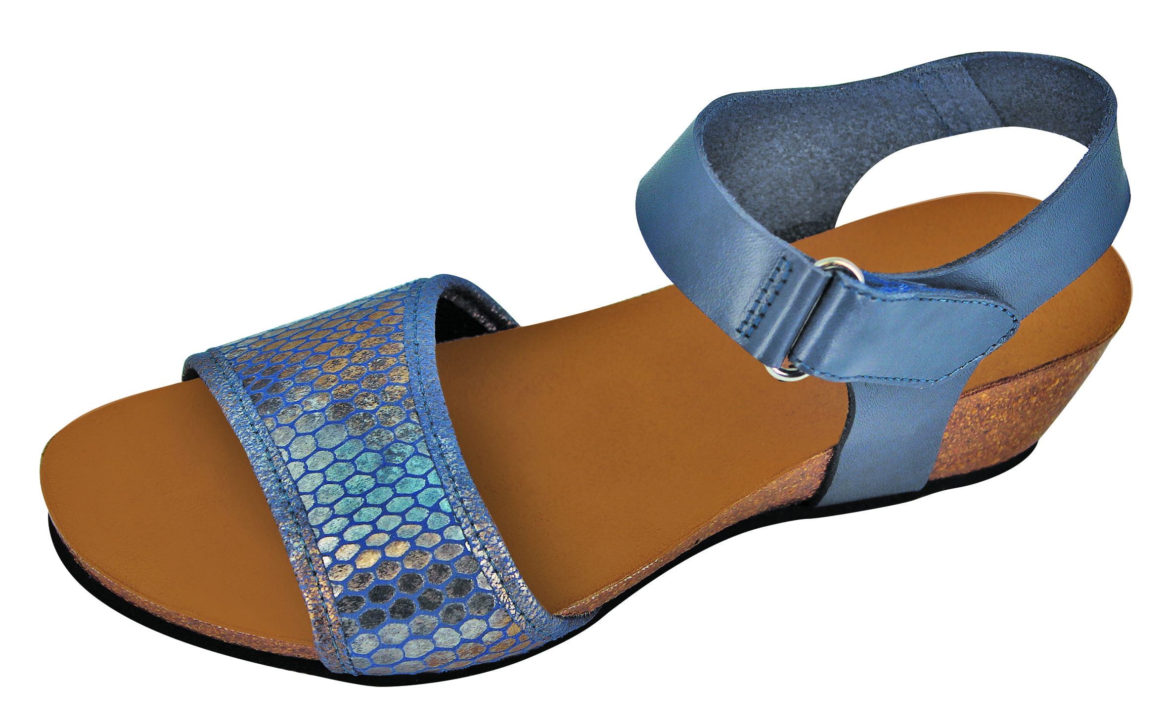 Grâce à sa bride réglable fermée par scratch, cette sandale est adaptée même aux chevilles fortes. Facile à vivre, le modèle se décline en 3 couleurs : bleu métallique, noir serpent, taupe métallique.