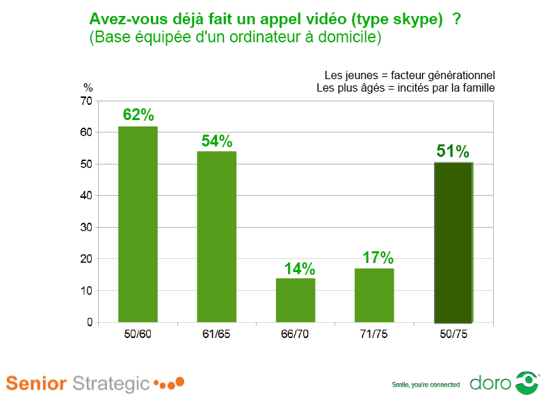 51% des séniors déclarent avoir déjà eu l’occasion d’utiliser un appel vidéo de type skype (62% pour les 50/60 ans) notamment grâce à l’intervention d’un membre de leur famille. D’ailleurs la famille et les amis restent les personnes appelées en priorité par les séniors en cas de souci informatique.
