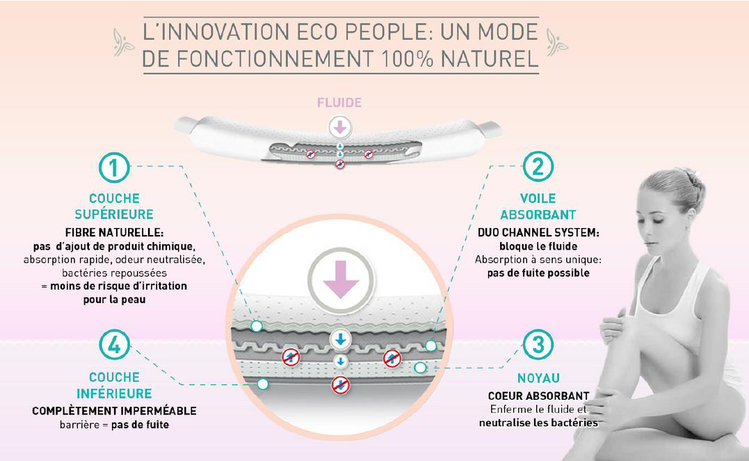 EcoPeople est une marque danoise qui propose une gamme de protections contre l’incontinence urinaire féminine « 100 % naturelles ». Biodégradables, ces protections hypoallergéniques sont conçues à partir de fibres naturelles.