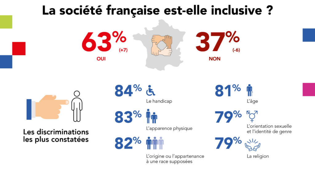 Les Français accordent une attention croissante à l’inclusion et leur lutte contre les discriminations s‘intensifie. Cependant, malgré cette prise de conscience, la quasi-totalité d’entre eux reconnaissent que des formes de discrimination persistent. Il est donc primordial que leurs concitoyens, les pouvoirs publics, et particulièrement les entreprises, continuent à accroître leurs efforts dans ce domaine, afin de voir ces sentiments de discrimination s’estomper.