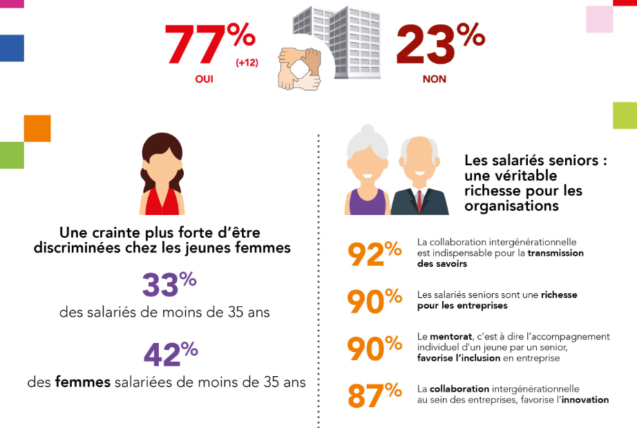 La présence des seniors au travail apparaît comme une évidence pour les Français, ils affirment qu’elle représente une véritable richesse pour les entreprises (90%). En outre, ils sont 92% à estimer que la collaboration intergénérationnelle est indispensable à la transmission des savoirs, elle favorise l’innovation (87%) et le développement du mentorat des jeunes (90%), permettant in fine l’inclusion en entreprise. D’ailleurs la collaboration intergénérationnelle est de mise au sein des organisations françaises : 71% des salariés déclarent travailler régulièrement avec des personnes âgées de 50 ans ou plus, et 69% indiquent même que certains des collègues dont ils sont le plus proches sont des seniors.