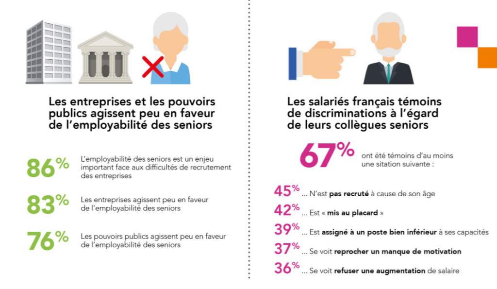 Alors que selon les Français, les salariés seniors bénéficient de bonnes conditions de travail au sein de leur entreprise (75%), ils décrivent l’âge comme le 4ème domaine sur lequel il y a le plus de discriminations en France (81%). En parallèle, deux tiers d’entre eux (65%) s’inquiètent du traitement réservé aux seniors et du manque d’actions en faveur de leur inclusion dans la société.