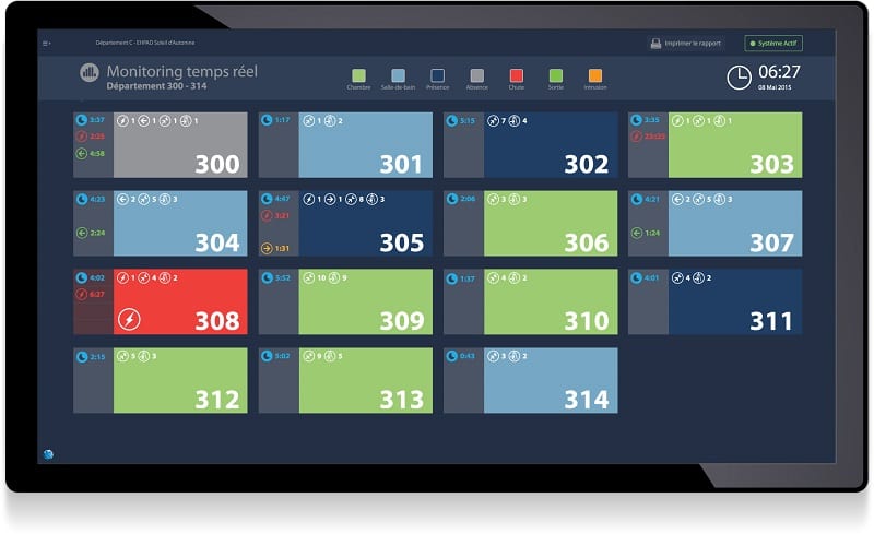 Dès le départ, les sols connectés sont apparus comme une technologie incontournable. En effet, nos chambres neuves ont toutes été équipées de la technologie FloorInMotion de la société Tarkett. Ces sols connectés permettent aux soignants de détecter les chutes en chambre en temps réel et d’intervenir rapidement.