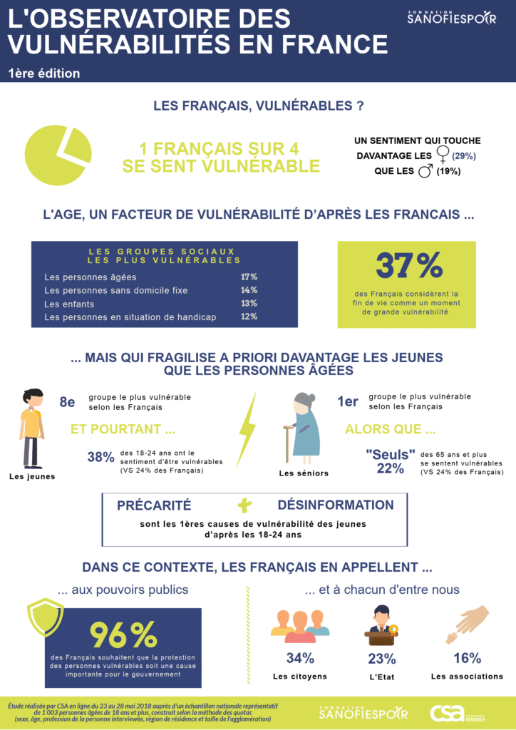 À l’occasion de l’organisation d’une grande journée portant sur les « vulnérabilités et le parcours de vie en France », la Fondation Sanofi Espoir a missionné l’institut de sondage CSA Research pour lancer un Observatoire des vulnérabilités en France, qui dresse pour la première fois l’état de l’opinion des Français et leurs représentations autour de cette problématique. Ce questionnaire a été mis en ligne du 23 au 28 mai sur un échantillon de 1003 personnes représentatif de la population française âgée de 18 ans et plus.