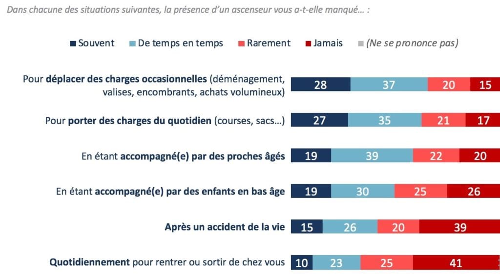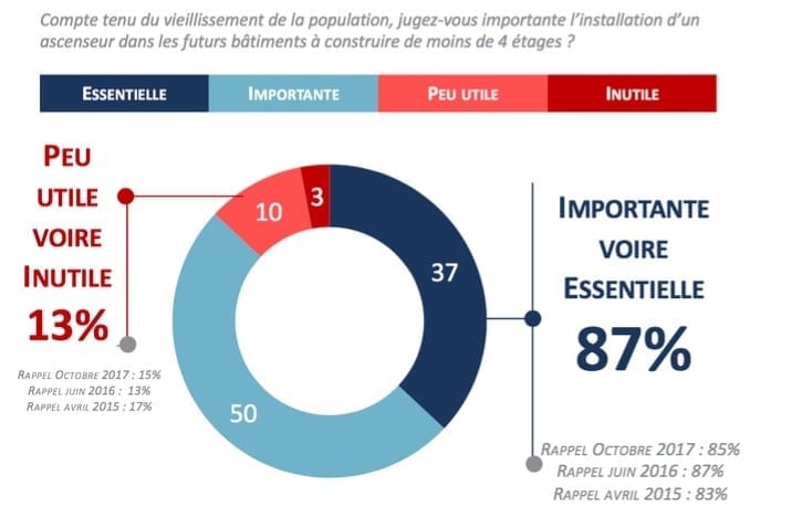 En ce début d’année 2019, l’opinion des Français sur l’équipement en ascenseurs en France et les besoins en accessibilité souligne un besoin essentiel d’installation dans les futurs immeubles résidentiels de moins de 4 étages, et dans davantage de lieux publics. Également facilitateur du maintien à domicile, l’ascenseur continue de figurer parmi le top 3 des équipements sollicités par les Français pour bien vieillir chez eux.