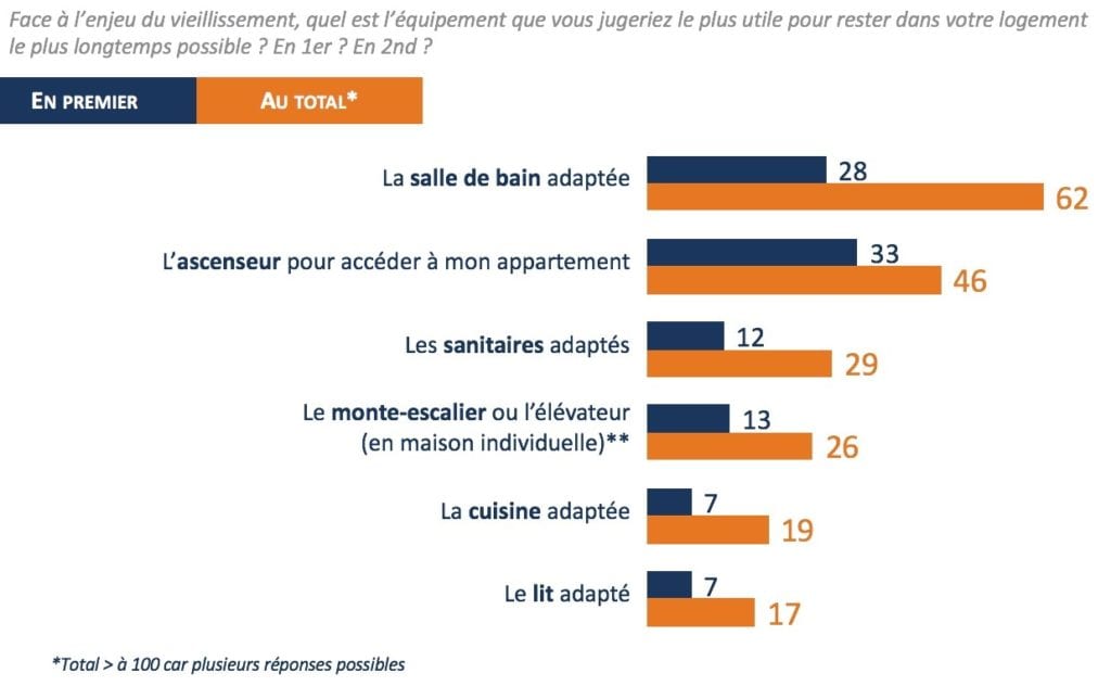 Face à l’allongement de la durée de vie de la population, adapter son habitat est une solution majeure pour rester le plus longtemps possible dans son logement. Les Français considèrent, en 1er choix, que les 3 équipements les plus utiles pour faciliter le maintien à domicile sont : l’ascenseur (33%), la salle de bain adaptée (28%) et le monte-escalier ou l’élévateur (en maison individuelle) (26%).