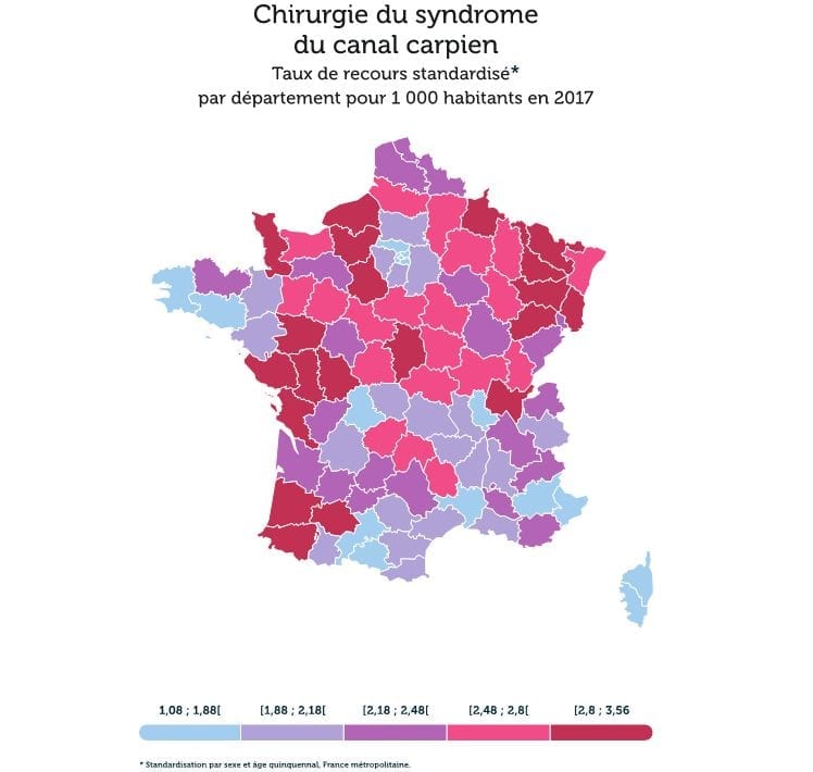 Le taux de recours standardisé de la chirurgie du canal carpien montre des disparités importantes en France, allant de 1.1 à 3.6 pour 1000 habitants, sans que des éléments objectifs ne puissent expliquer de telles variations de pratiques.