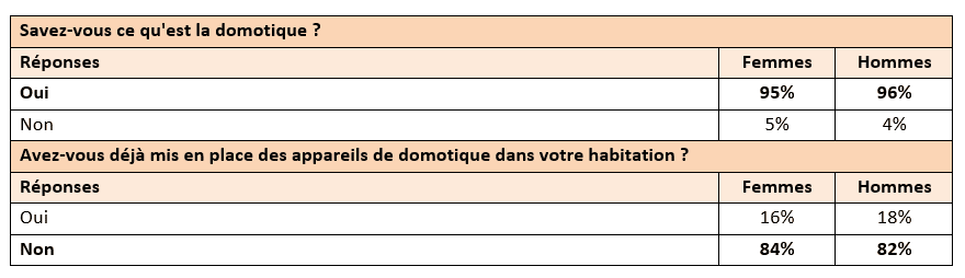 Plus de 95% des Français déclarent savoir ce que représente l’univers de la domotique (95% pour les femmes et 96% pour les hommes). En revanche, ils ne sont que 17% à avoir déjà mis en place des appareils de domotique dans leur habitation (16% pour les femmes et 18% pour les hommes).