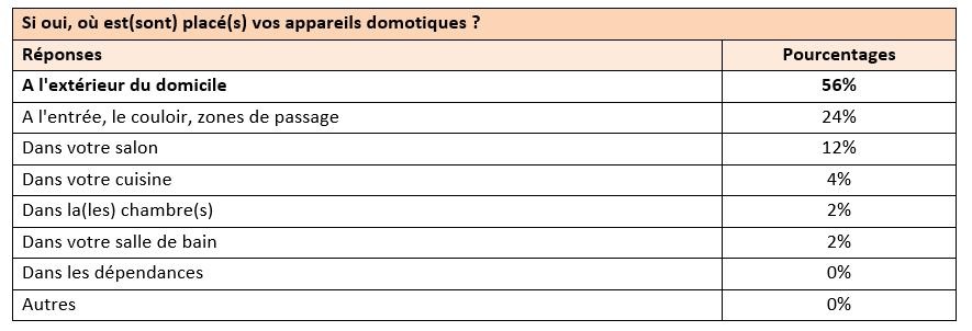 Pour les personnes déjà équipées, les appareils de domotique se situent principalement à l’extérieur de l’habitation pour 56% des personnes interrogées. En deuxième position se trouvent les entrées et les zones de passage à 24%, suivies du salon avec 12%.