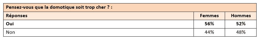 Le coût de l’équipement en appareils domotiques semble être un frein évident pour la plupart des consommateurs. Ainsi, plus de 56% des femmes et 52% des hommes interrogés déclarent trouver les prix en domotique trop élevés.