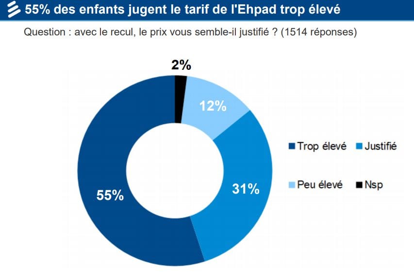 Ils sont peu satisfaits de la qualité des repas, de l’aide apportée pour les gestes de la vie quotidienne, mais apprécient les attentions et la gentillesse des équipes. 77% des sondés jugent toutefois le personnel trop peu nombreux et 42% des enfants pensent que leur parent « vit mal » en EHPAD.