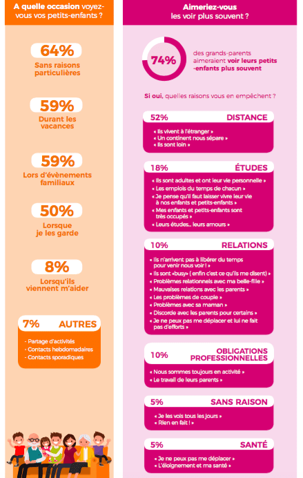D’après les résultats du sondage, les grands-parents échangent de façon régulière avec leurs petits-enfants, en effet 82% des répondants sont en contact avec eux plus d’une fois par mois par le biais de visites ou d’ appels en majeure partie. Malgré ce constat 74% aimeraient voir davantage leurs petits-enfants mais le frein principal est la distance qui les sépare.