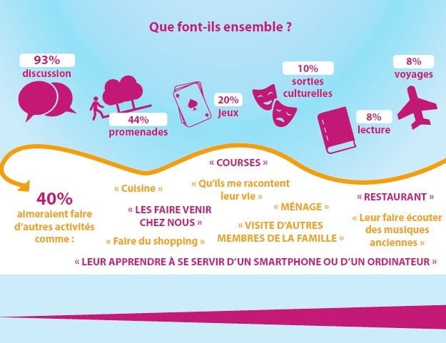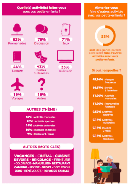 Lors des moments partagés avec leurs petits-enfants, les activités sont assez similaires pour l’ensemble des grands-parents : promenades, discussions, jeux. Cependant 53% d’entre eux aimeraient enrichir ces moments de partage notamment en partageant des vacances en famille !