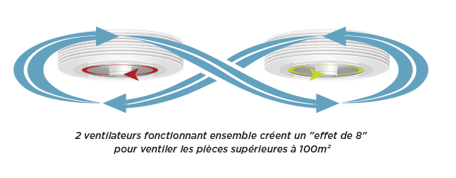 Pour des pièces de superficie plus importante, 2 ventilateurs Exhale qui tournent en sens opposé peuvent maintenir une régulation thermique homogène.