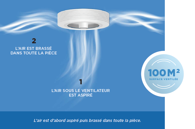 Contrairement à un ventilateur de plafond à pâles, avec Exhale, l’air est d’abord aspiré puis brassé dans toute la pièce.